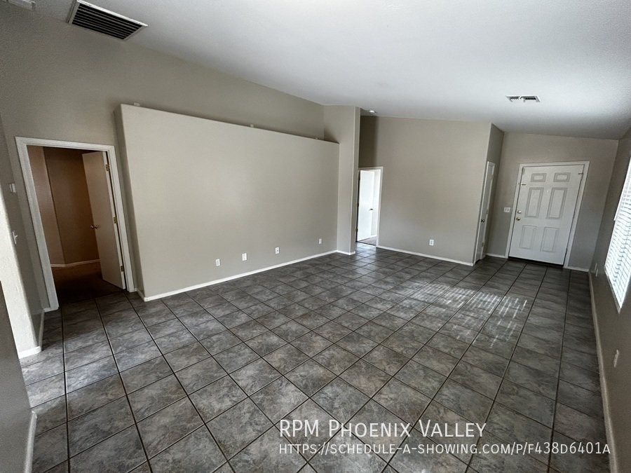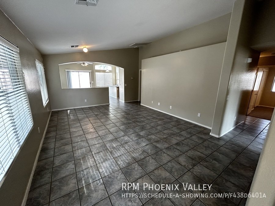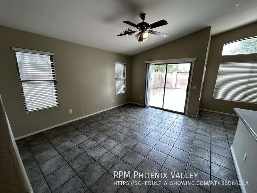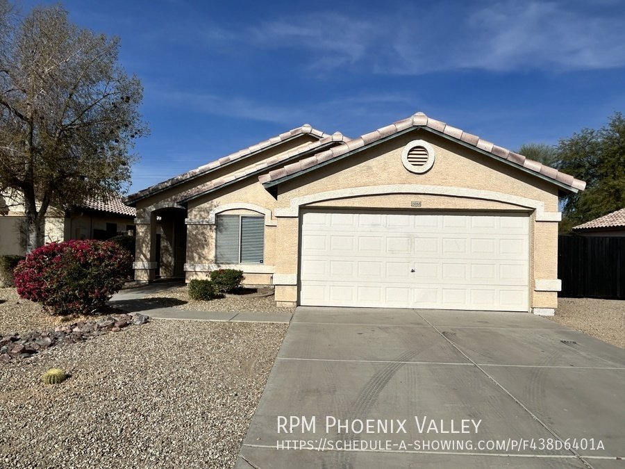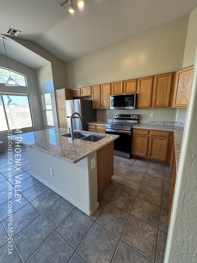 Open Concept 4 Bed / 2 Bath **Single Story** Home With All New Paint, No CARPET and all new stainless Steel kitchen appliances. Main living area offers an open layout with vaulted ceilings and tile throughout. Large family room perfect for gatherings & entertainment. Formal dining area. Eat in kitchen with *NEW* counter tops, bay windows, island and all kitchen appliances!! Split floor plan; just off the living area you have the primary suite which includes walk in closet & private bathroom. Washer & dryer connections in full indoor laundry room. Three additional guest bedrooms are at the front of the home along with the guest bath. Easy to maintain desert landscaping front & back. Home is friendly to a max of two spayed/neutered pets with additional $450 per pet fee. **SHED IN SIDE YARD NOT AVAILABLE FOR TENANT USE**.