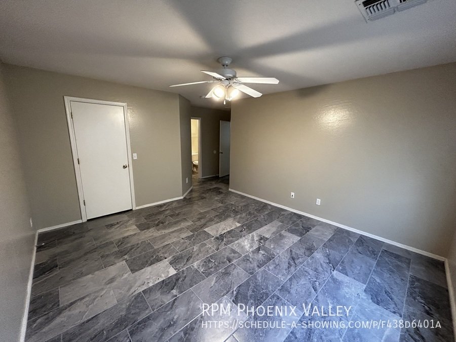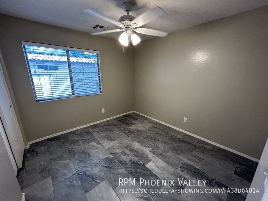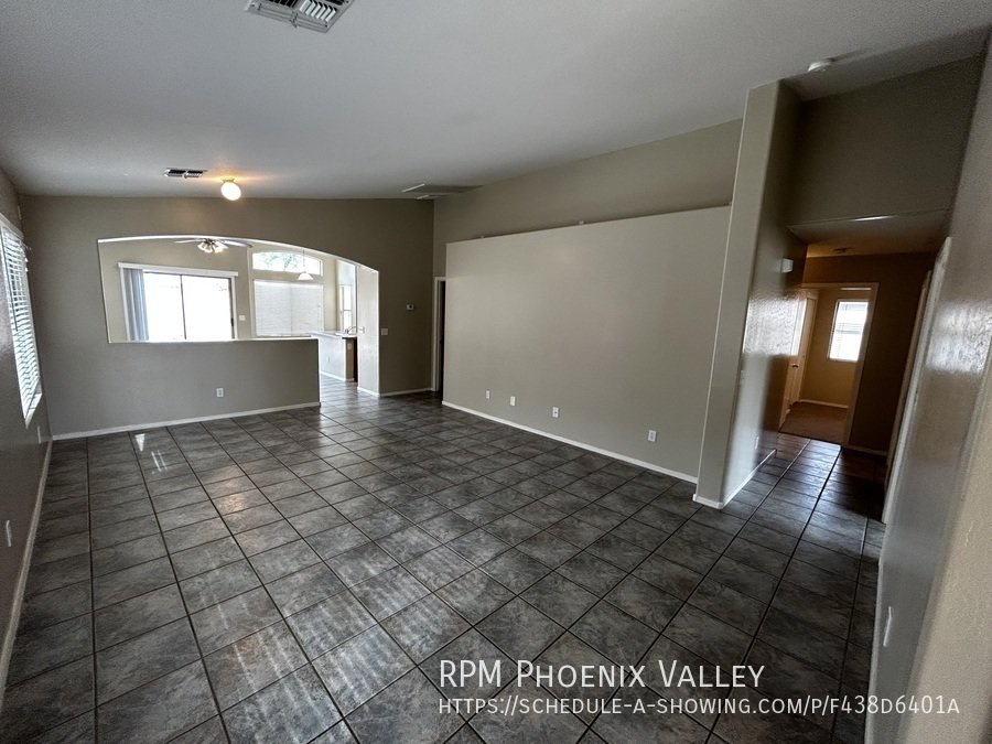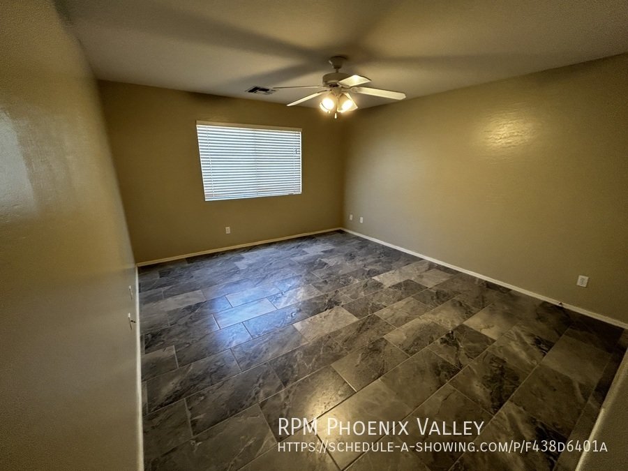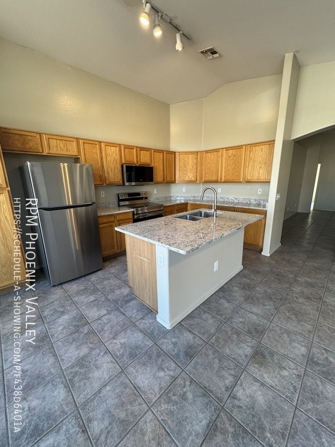 Open Concept 4 Bed / 2 Bath **Single Story** Home With All New Paint, No CARPET and all new stainless Steel kitchen appliances. Main living area offers an open layout with vaulted ceilings and tile throughout. Large family room perfect for gatherings & entertainment. Formal dining area. Eat in kitchen with *NEW* counter tops, bay windows, island and all kitchen appliances!! Split floor plan; just off the living area you have the primary suite which includes walk in closet & private bathroom. Washer & dryer connections in full indoor laundry room. Three additional guest bedrooms are at the front of the home along with the guest bath. Easy to maintain desert landscaping front & back. Home is friendly to a max of two spayed/neutered pets with additional $450 per pet fee. **SHED IN SIDE YARD NOT AVAILABLE FOR TENANT USE**.