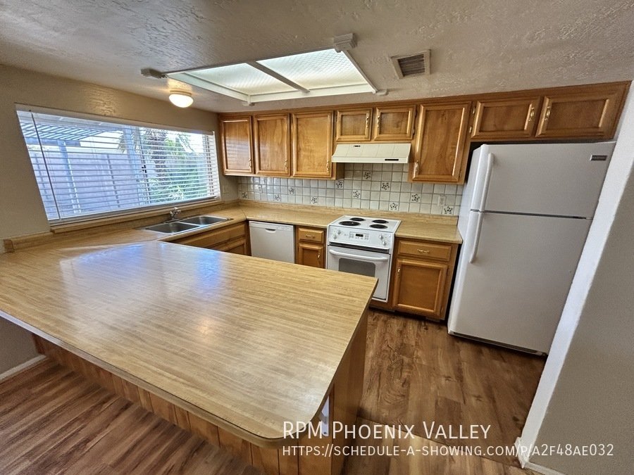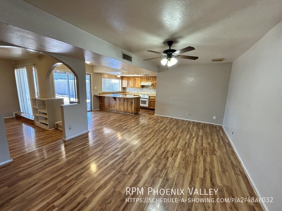 All common areas are a Warm custom taupe and the home feature wood floors so carpet only in bedrooms! Main living area features has custom neutral tan paint with a dining, living, sunken den with build ins and open concept kitchen. Kitchen offers wood plank flooring, all white appliances and great breakfast bar. Decorative arches allow for awesome natural light in the main living areas. Kitchen is connected to the full laundry room with washer and dryer hookups and wood plank flooring. The master suite includes double door entry, full private bathroom with wood plank flooring, tiled shower and walk in closet with built ins. Two additional guest bedrooms with arched windows and side by side closets share a hall bath also featuring wood planking flooring! Extra storage unit in the front off of the carport. Allowing 2 pets with $500 per pet fee.