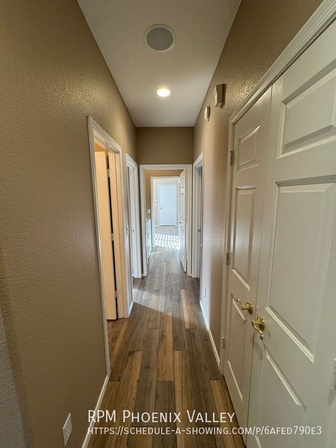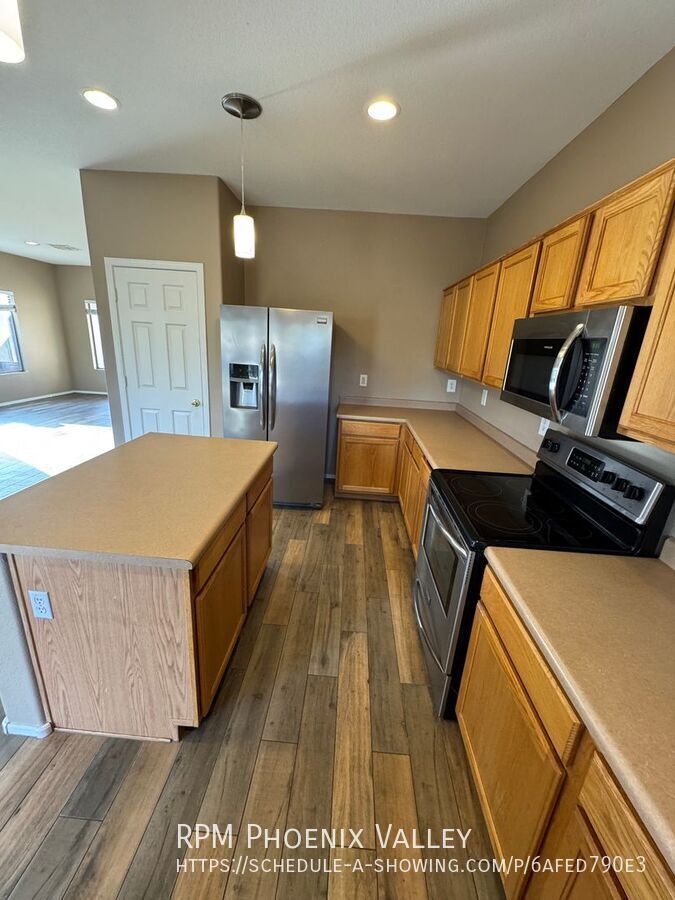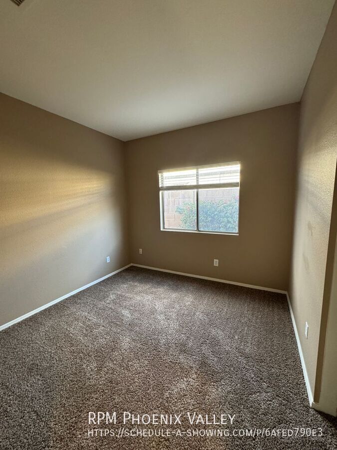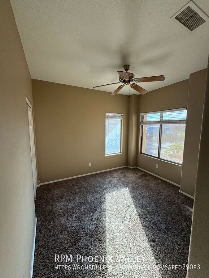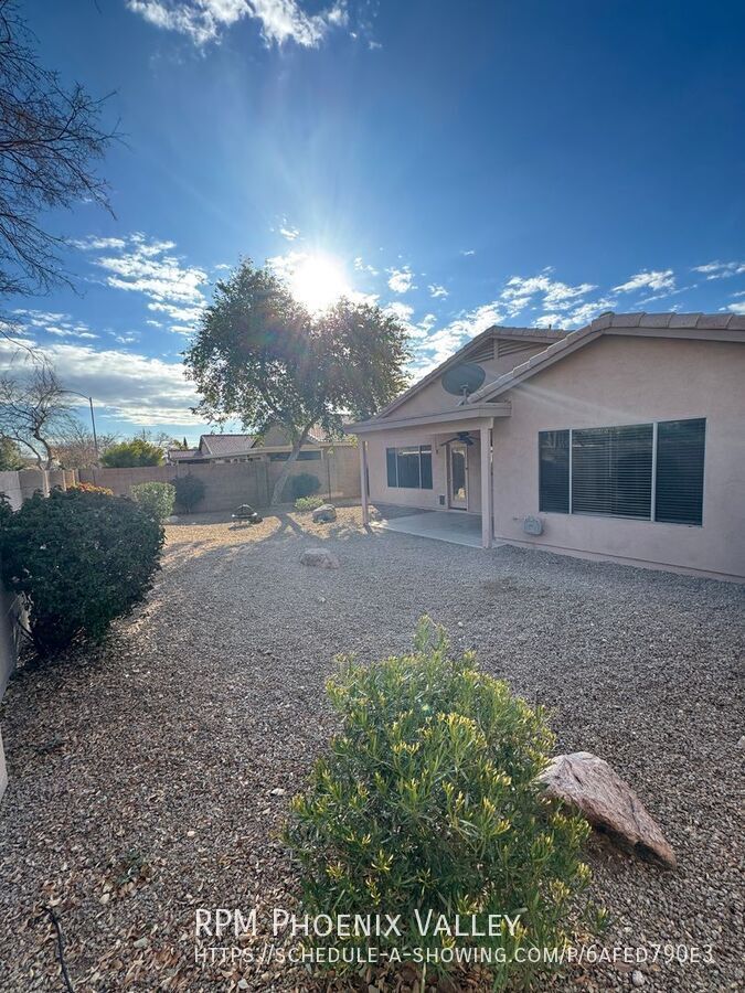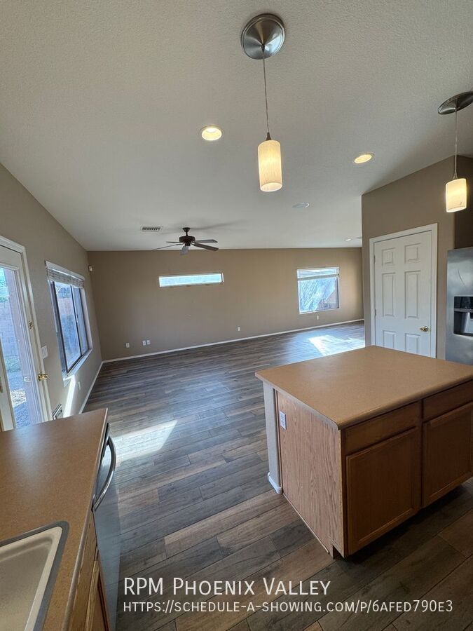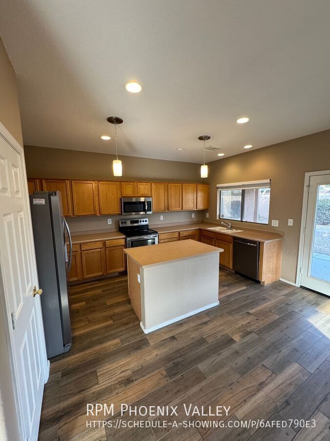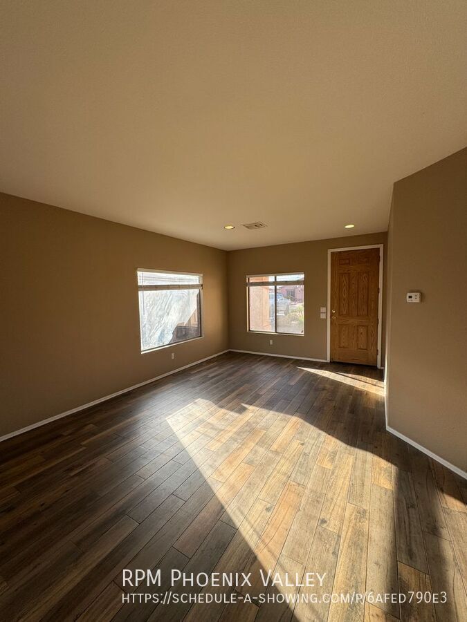 Tile plank flooring everywhere but bedrooms + custom paint color throughout! Common area includes an Open concept entry, den, kitchen and bonus room great for a home office. Kitchen features an island, recessed lighting, stainless steel appliances and a pantry. Two large guest bedrooms with side-by-side closets share a hall bathroom. Full size laundry room with washer & dryer included. Primary suite with walk in bathrooms including dual sinks, separate tub, glass shower, separate toilet room and walk in closet. Oversized back yard and desert landscaping front + back. Home is pet friendly to a max of 2 spayed/neutered pets with a $400 deposit per.