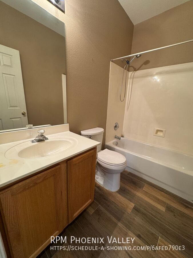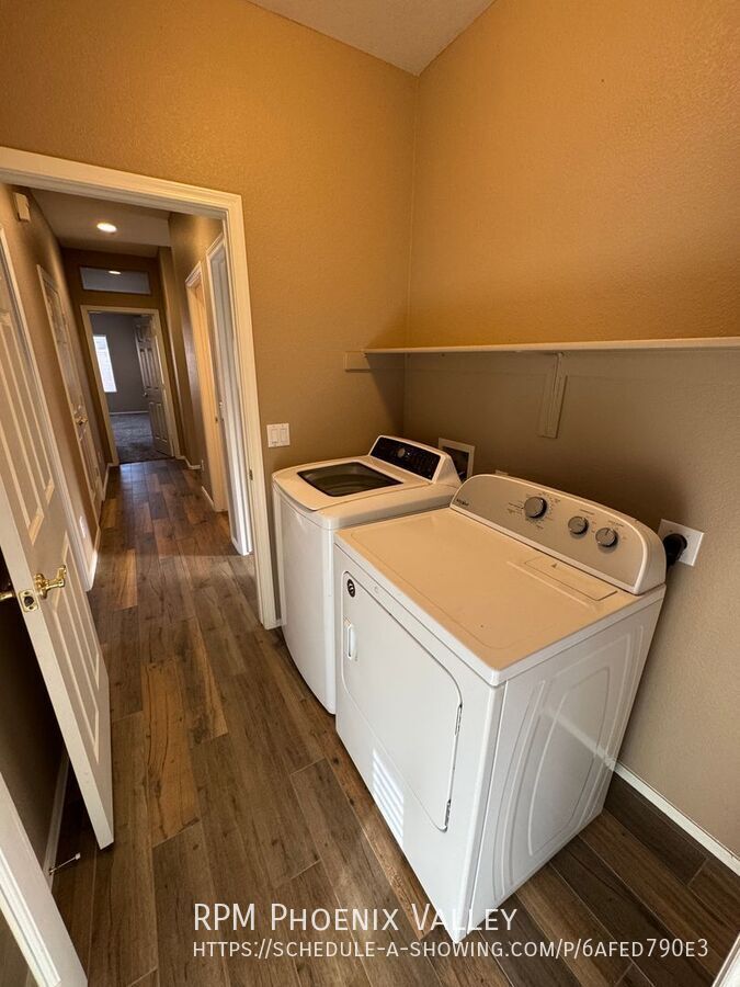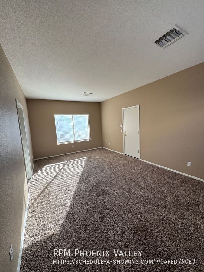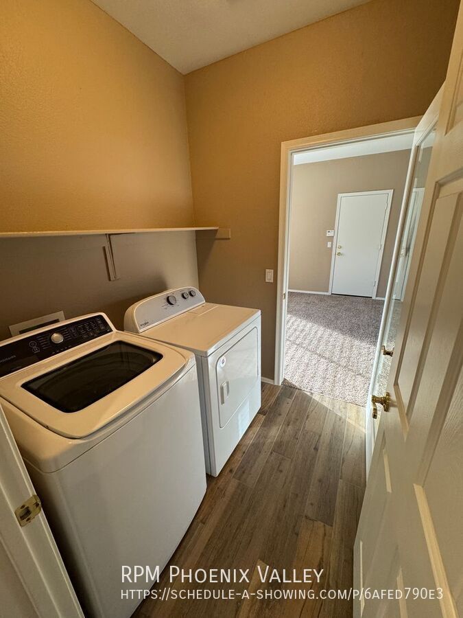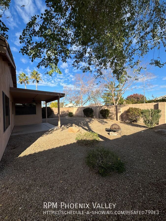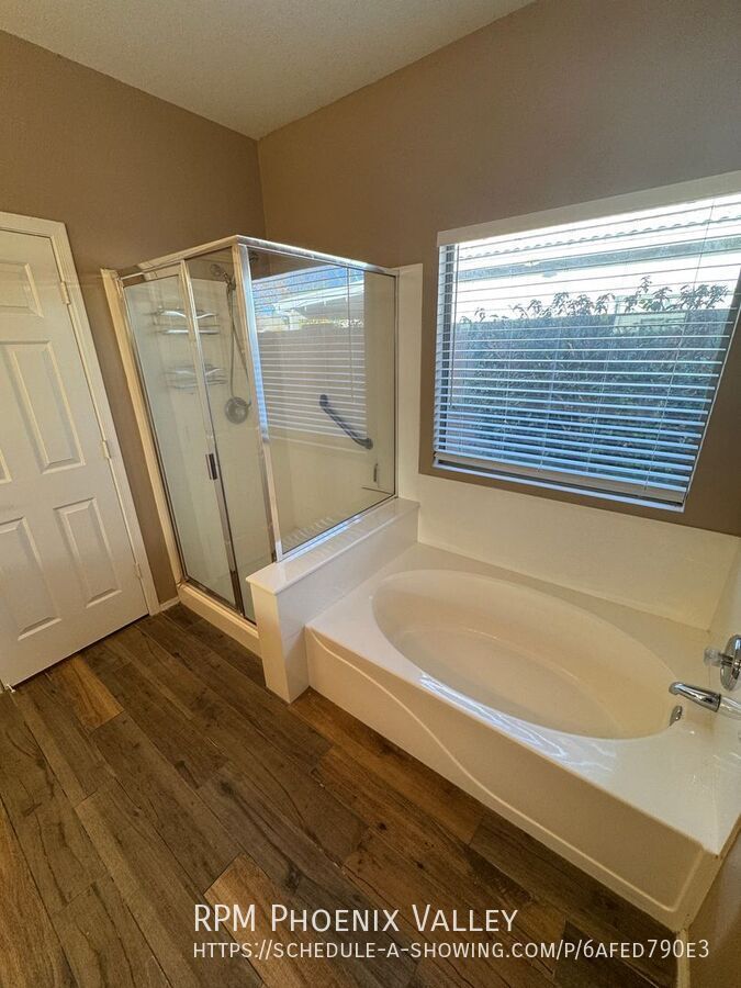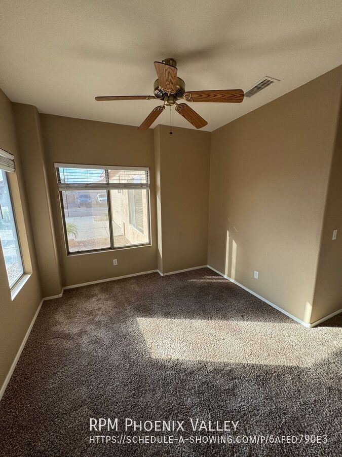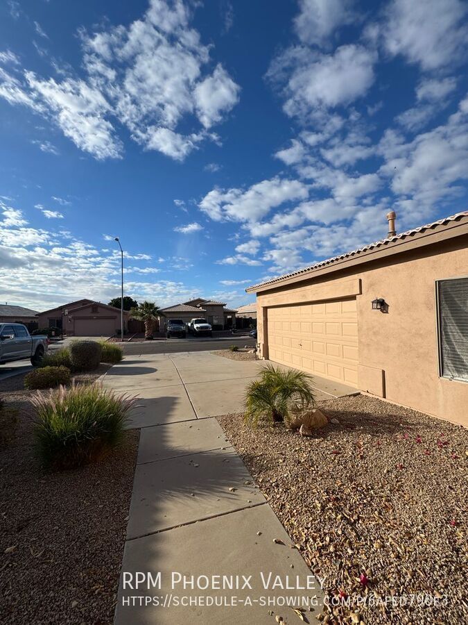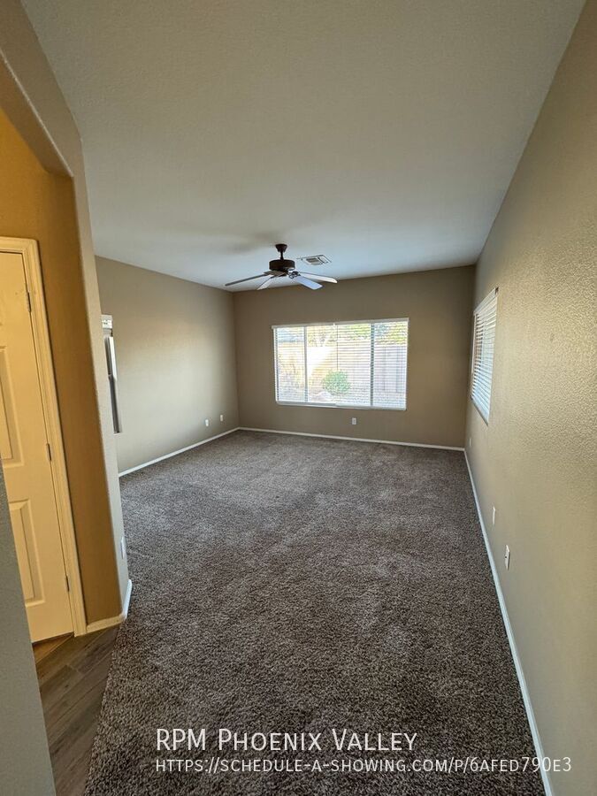 Tile plank flooring everywhere but bedrooms + custom paint color throughout! Common area includes an Open concept entry, den, kitchen and bonus room great for a home office. Kitchen features an island, recessed lighting, stainless steel appliances and a pantry. Two large guest bedrooms with side-by-side closets share a hall bathroom. Full size laundry room with washer & dryer included. Primary suite with walk in bathrooms including dual sinks, separate tub, glass shower, separate toilet room and walk in closet. Oversized back yard and desert landscaping front + back. Home is pet friendly to a max of 2 spayed/neutered pets with a $400 deposit per.