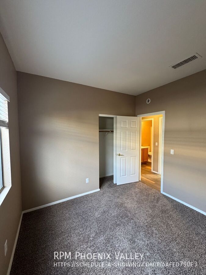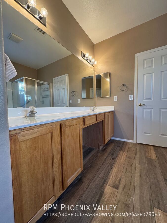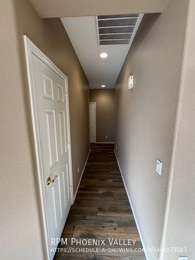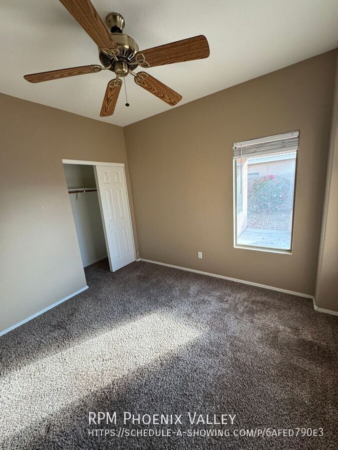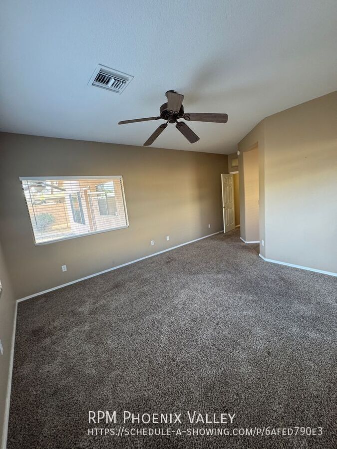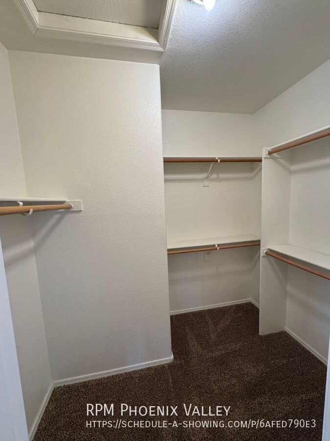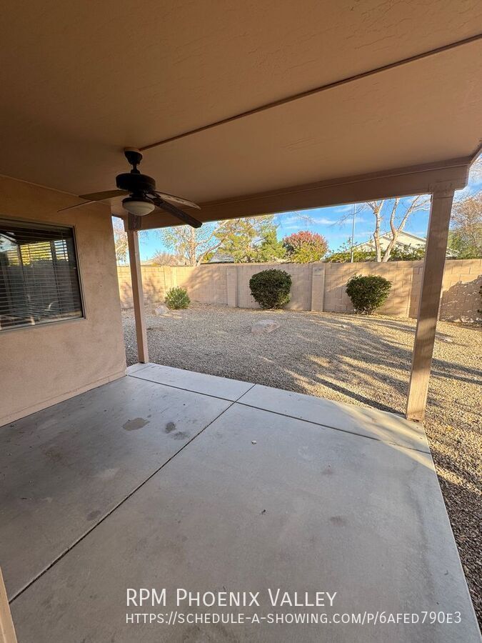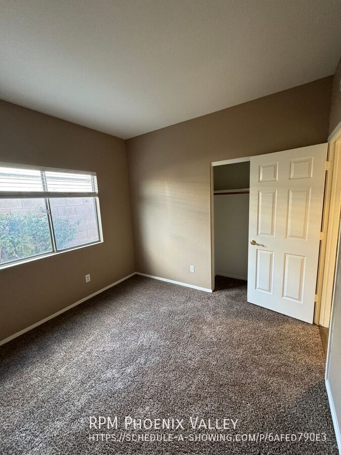 Tile plank flooring everywhere but bedrooms + custom paint color throughout! Common area includes an Open concept entry, den, kitchen and bonus room great for a home office. Kitchen features an island, recessed lighting, stainless steel appliances and a pantry. Two large guest bedrooms with side-by-side closets share a hall bathroom. Full size laundry room with washer & dryer included. Primary suite with walk in bathrooms including dual sinks, separate tub, glass shower, separate toilet room and walk in closet. Oversized back yard and desert landscaping front + back. Home is pet friendly to a max of 2 spayed/neutered pets with a $400 deposit per.