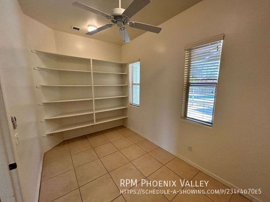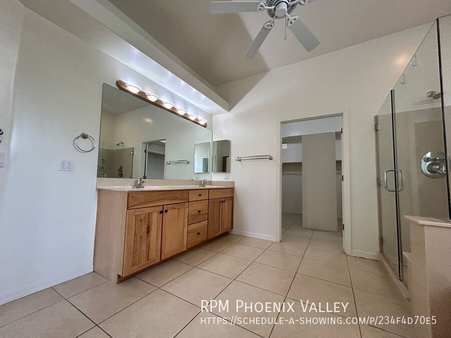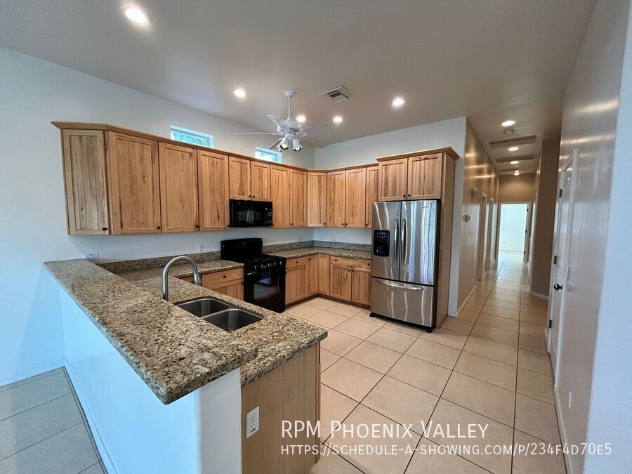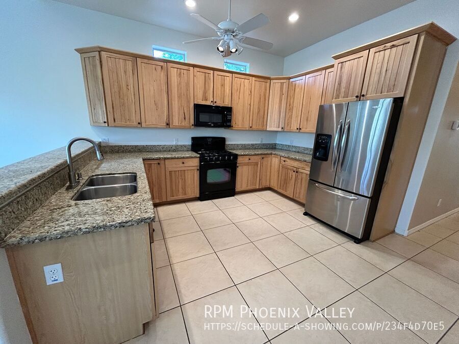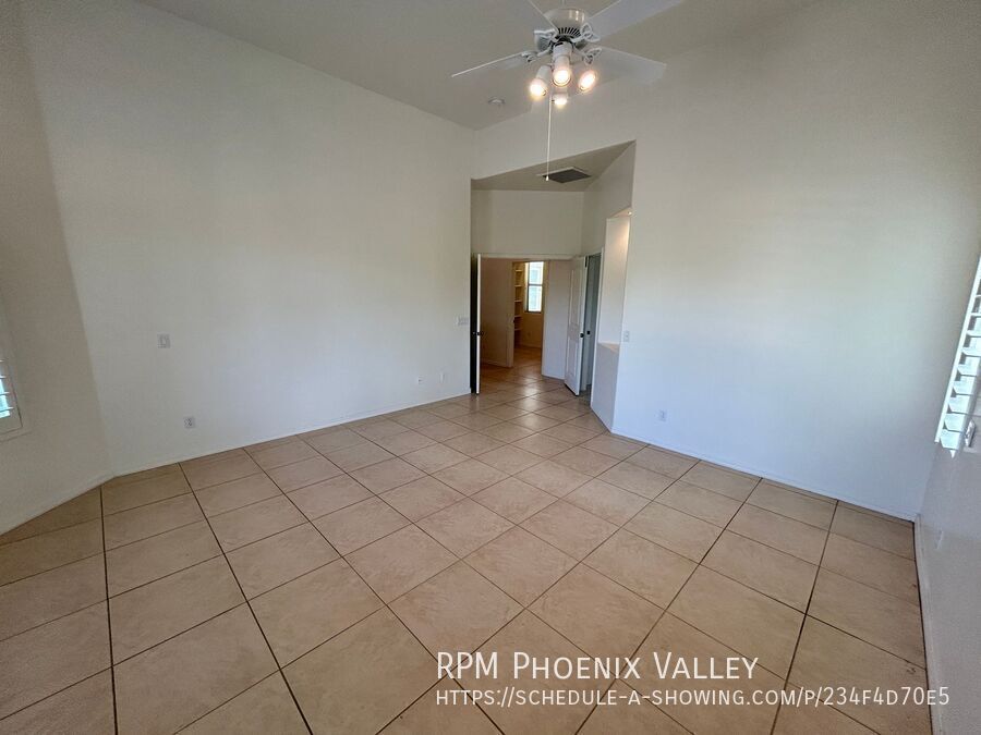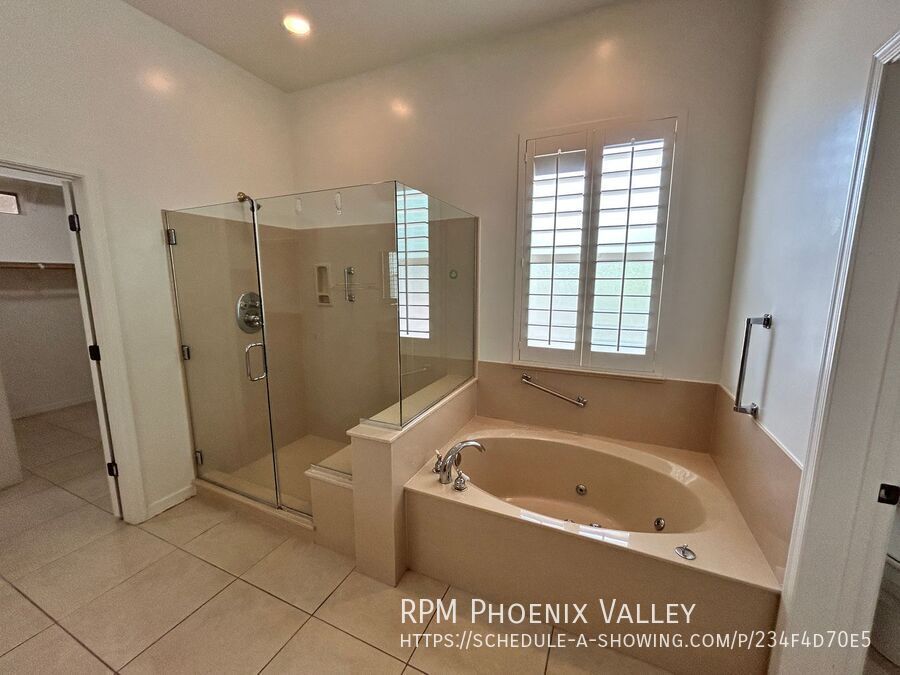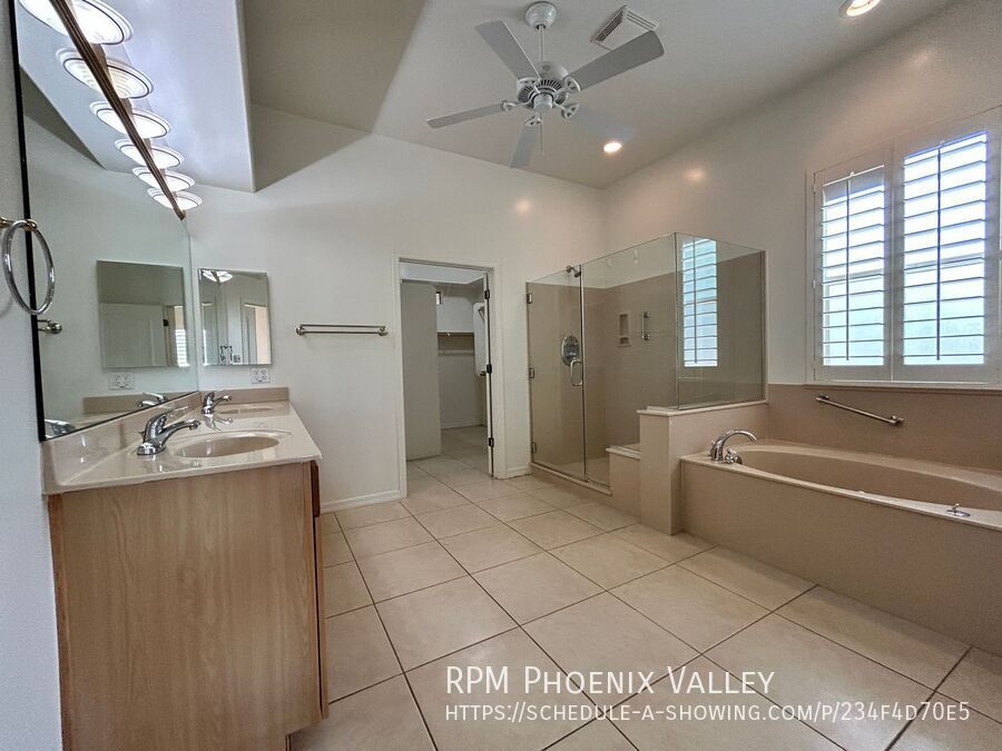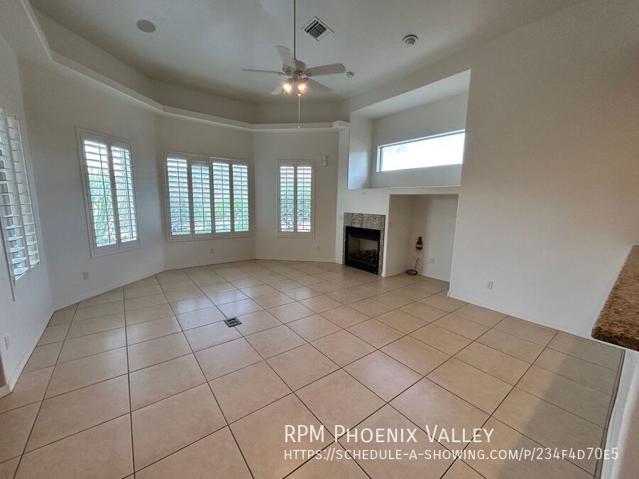 Entire home features bright larger tile with custom inlets and plantation shutters! Open concept main living area with formal dining, living and family room offering vaulted ceilings for awesome natural light. Kitchen features granite counter tops, recessed lighting, all black appliances including a gas stove, breakfast bar & walk in pantry. Large laundry room with built in shelving. Split floor plan; three nice sized guest bedrooms share guest bath. Decadent Grande primary suite with bay windows, private bath offering dual sinks, garden style tub, all glass shower, separate toilet room and enormous walk in closet with two separate sides! Incredible desert landscaping with Mountain views and gated heated pool; landscaping & pool services included. Home is solar for reduced energy costs. Base rent doesn't include $250/monthly water/sewage fee. Home is friendly to a max of two spayed/neutered pets with $500 per pet fee.
