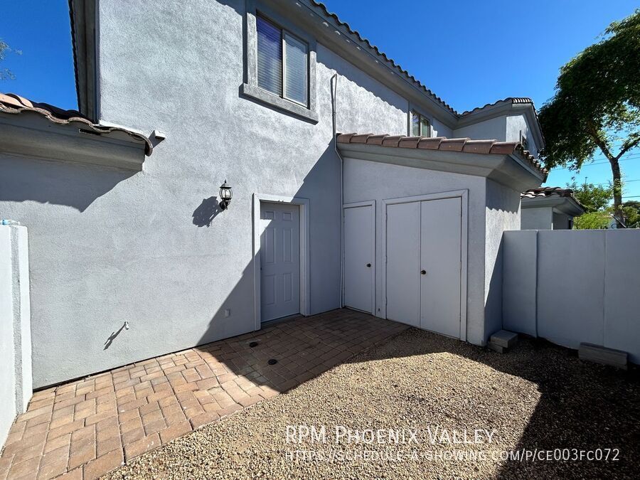 You will step into the main living area that offers an open concept dining & kitchen with back splash and stainless-steel appliances & all NEW PAINT. The primary bedroom is located on the first floor that includes a full bathroom and walk-in closet with an access to the enclosed back patio for privacy and there is extra storage. Washer/dryer hookups complete the first floor (with new washer/dry to be installed just after move in). Upstairs features two nice sized bedrooms with plenty closet space that share a full hallway bath. Home is friendly to a max of two spayed/neutered pets with additional $350 pet fee per pet.