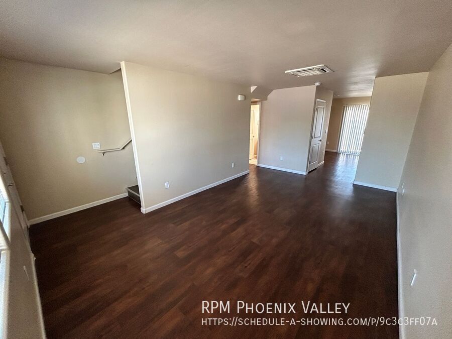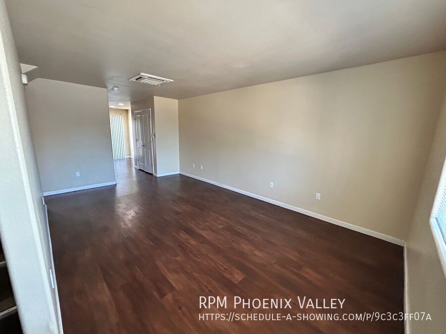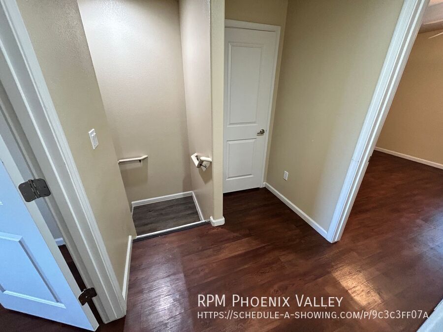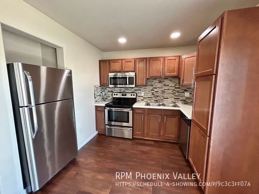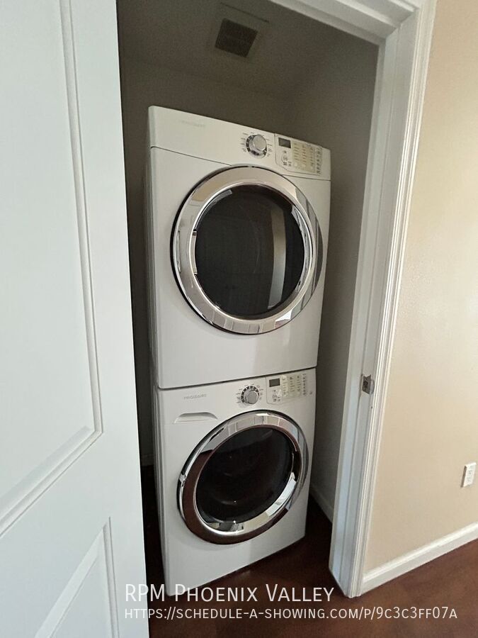 The first floor includes a sunny living room, a large den, half bath with pedestal sink & tile back splash, stacked washer & dryer and an eat in kitchen. Kitchen features decorative backsplash tile, recessed lighting and all stainless steel appliances! Wood plank flooring & tile throughout and NO carpets! Two nice sized bedrooms upstairs; one with a large three door closet. The shared hallway bath also with decorative tile back splash. Home is friendly to a max of two spayed/neutered pets with $350 per pet fee.