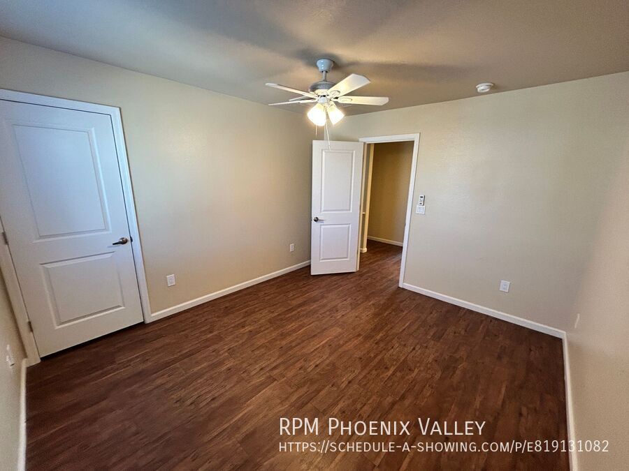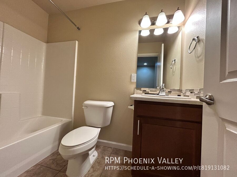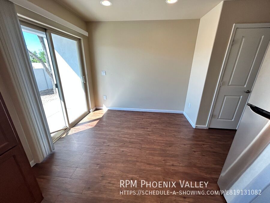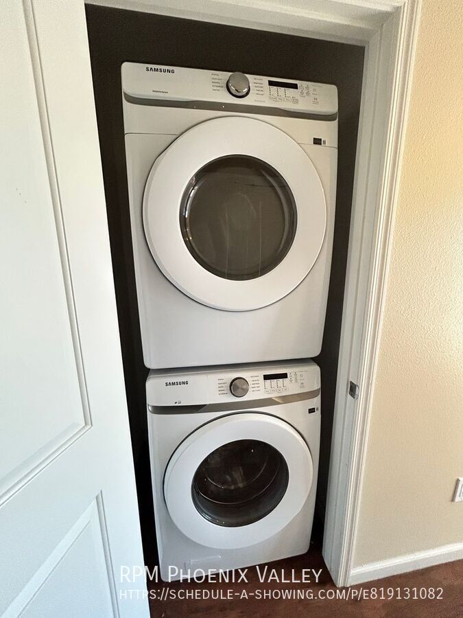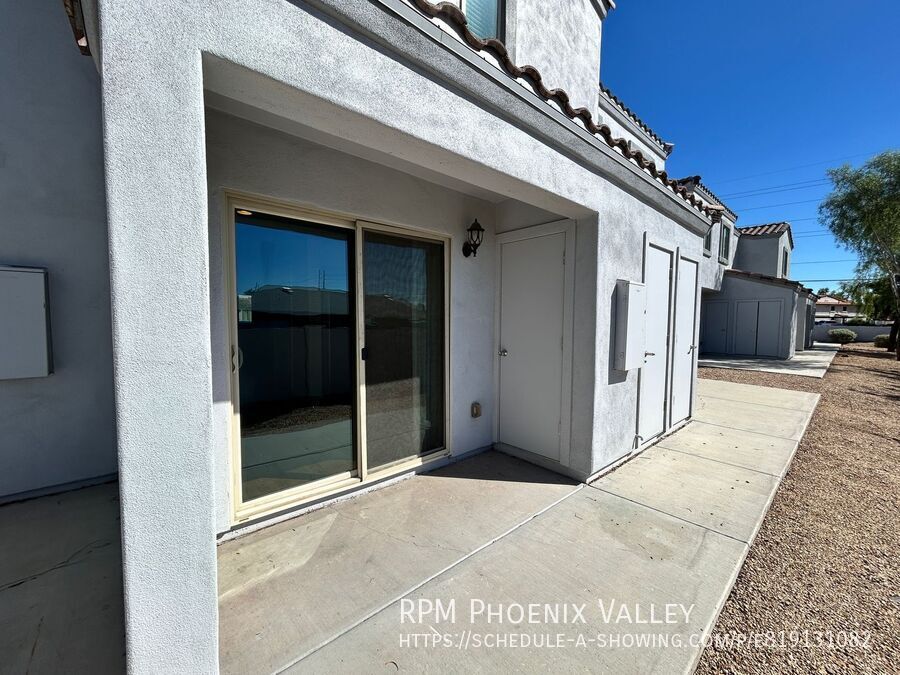This charming two-level townhome welcomes you with a bright living area and a flexible den space, ideal for office or play area. The main floor features an updated kitchen offering recessed lighting, stainless steel appliances, and a decorative tile backsplash that adds a touch of character. A half bathroom with a pedestal sink and elegant tile accent wall, along with a brand NEW stacked washer/dryer is also on the first floor for convenience. Enjoy wood-look plank and tile flooring throughout — and absolutely NO carpet! Up the stairs you’ll find two well-sized bedrooms with ceiling fans, one with a large three-door closet, and a shared hallway bath accented with decorative backsplash tile for a refined finish. The home is friendly to a max of two spayed/neutered pets with $350 per pet fee.