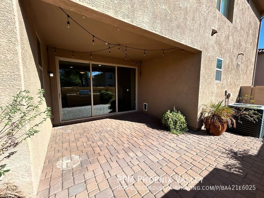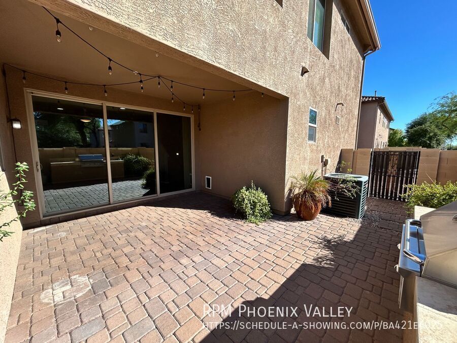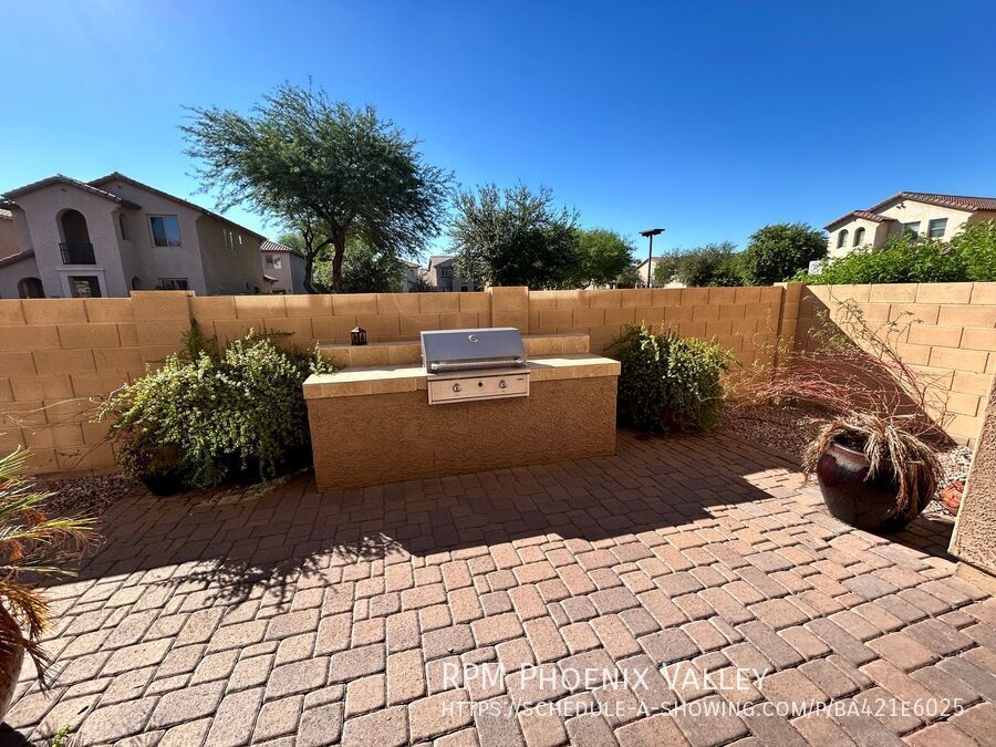 This beautifully designed home offers generous living space and thoughtful touches throughout. The main level features an inviting open-concept extended entry way, family room that flows throughout the lower level into the dining area with indoor/outdoor living. Enjoy an oversized sliding glass door leading to the yard with a paved covered patio and a built-in BBQ — perfect for entertaining or relaxing. The kitchen boasts stainless steel appliances, dark cabinetry and a convenient pantry. A half bath is located downstairs for guests, along with two additional storage closets for your organizational needs. Upstairs, the split floor plan provides privacy and comfort. The spacious primary suite features plush carpeting, dual walk-in closets, and an ensuite bath with dual sinks, a walk-in shower, and extended counter space with extra cabinetry. Two secondary bedrooms offer walk-in closets, ceiling fans, and share a beautifully updated hall bathroom with upgraded finishes. Home is friendly to a max of 2 spayed/neutered pets w/additional $550 per pet fee.