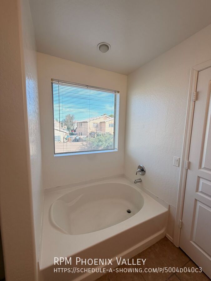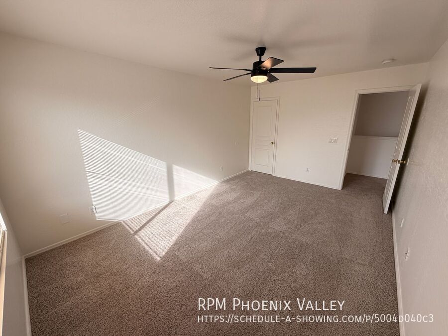 This expansive two-story residence offers three bedrooms and two and a half bathrooms with a thoughtfully designed floor plan that balances functionality and flexibility. Upon entry, you are welcomed by a spacious great room complemented by a separate family room, creating multiple living and entertaining areas. The eat-in kitchen features a center island, plenty cabinet space, and an oversized walk-in pantry with washer and dryer. A half bathroom is also located on the first floor for guests. Upstairs, a versatile loft provides the perfect space for a home office, media room, or play area. The primary suite is generously sized and includes a large walk-in closet and a private bathroom with dual sinks and a separate soaking tub and shower. Secondary bedrooms are well proportioned and share a full bathroom with double sinks. Additional interior features include ceiling fans, window coverings throughout, a mix of carpet and tile flooring. The exterior offers a two-car garage, covered patio for outdoor relaxation, and low-maintenance desert landscaping in both the front and backyard. Home is friendly to a max of two spayed/neutered pets with $350.00 per pet deposit.