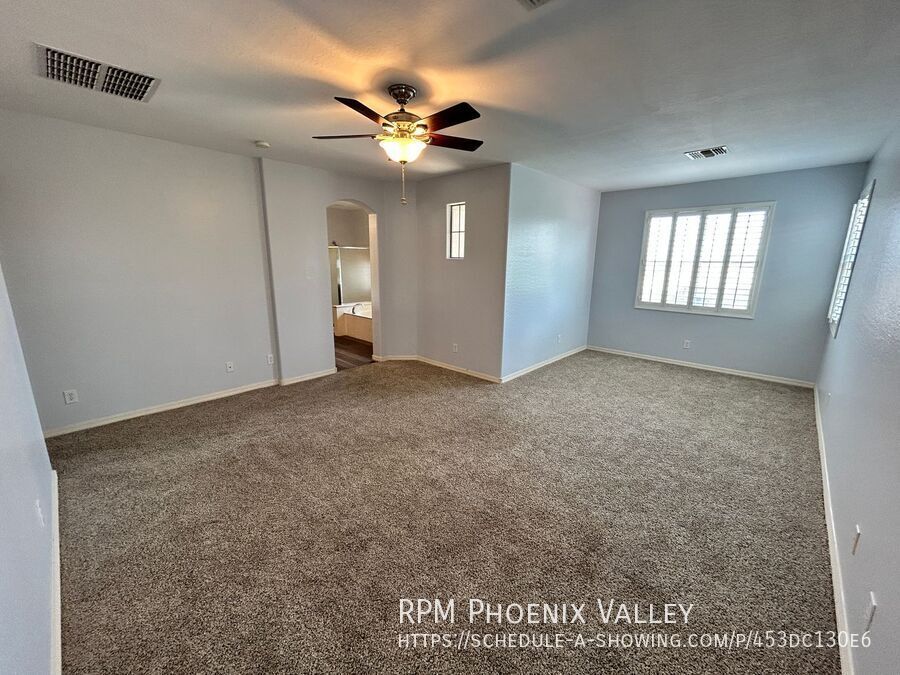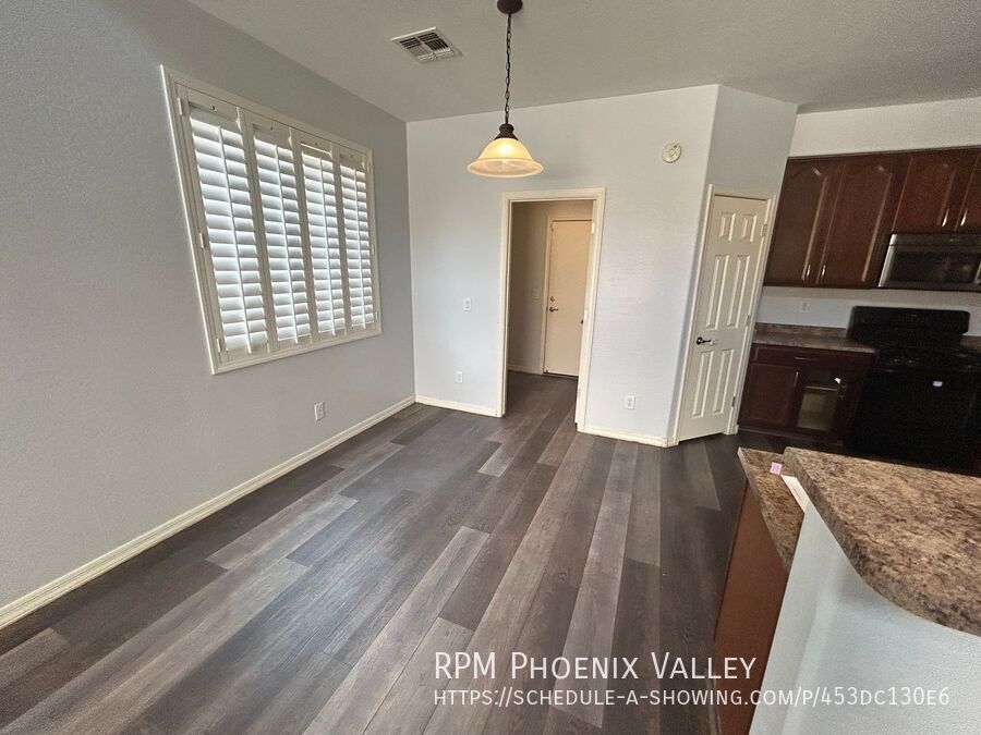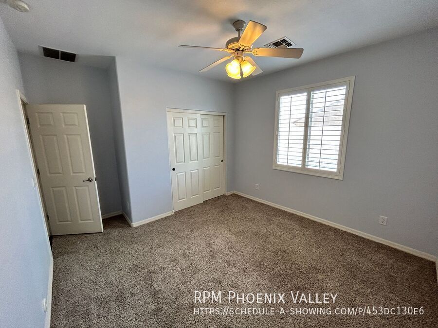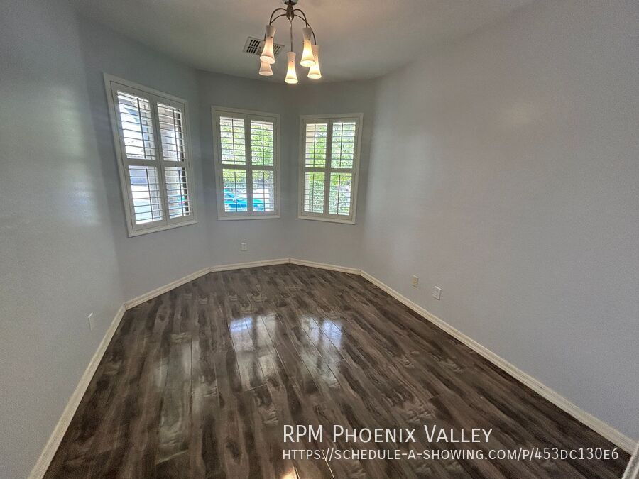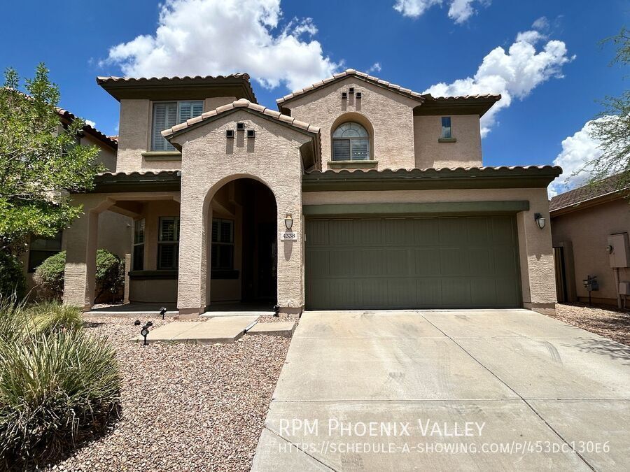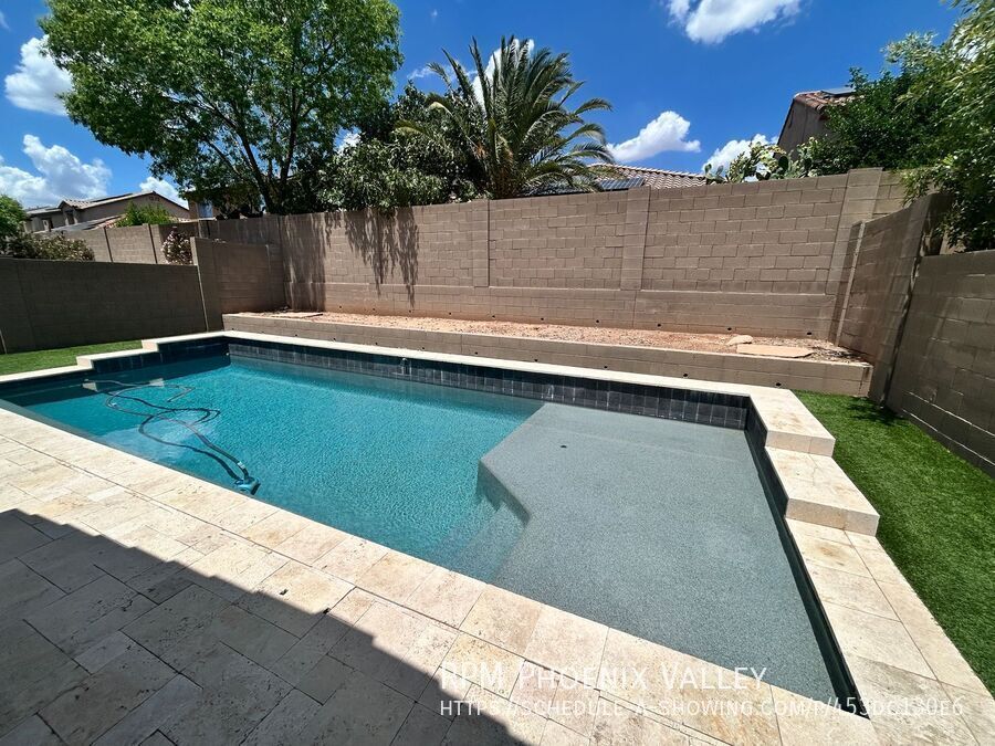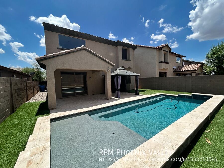 Full Bed + Bath Downstairs! Hard surface flooring everywhere but the bedrooms + custom *NEW* paint throughout! Downstairs offers a *FULL* bed + bath, separate den + open concept kitchen/living and dining area and full laundry room. Kitchen includes breakfast bar and *GAS* stove! Two additional guest beds upstairs both with 1 year old plush carpet share a guest bath with dual sinks. Large primary suite with sitting area, 1 year old plush carpet, private bath with dual sinks, separate toilet room, garden style tub, separate stand up shower, extra cabinets for storage and a walk in closet. Backyard includes sparkling pool with pool services included and artificial turf. Home is within walking distance to elementary school, Anthem shopping, parts and community center. Home is friendly to a max of two pets with $550 per pet fee. NEW WASHER/DRYER + FRIDGE TO BE INSTALLED AFTER NEW TENANT MOVE IN!